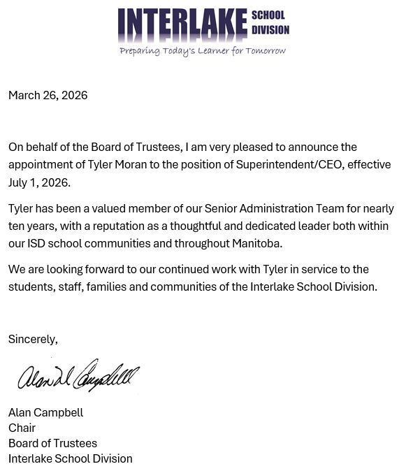 Following a Virtual Public Budget Meeting held on Monday, February 23rd and the review of stakeholder input on Monday, March 2nd, the Interlake School Division Board of Trustees passed the 2026-2027 Final Budget at a Regular Board Meeting held on Monday, March 9th. Please find below the 2026-2027 Final Budget At-A-Glance document outlining the details of the final budget. Interlake School Division Board of Trustees & Senior Administration